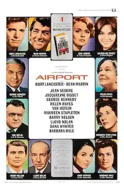 Airport is a 1970 American air disaster–drama film written and directed by George Seaton and starring Burt Lancaster and Dean Martin.[3] Based on Arthur Hailey's 1968 novel, it originated the 1970s disaster film genre.[4] It is also the first of four films in the Airport film series. Produced on a $10 million budget, it earned over $128 million. The supporting cast features Jean Seberg, Jacqueline Bisset, George Kennedy, Helen Hayes, Van Heflin, Maureen Stapleton, Barry Nelson, Lloyd Nolan, Dana Wynter and Barbara Hale.
