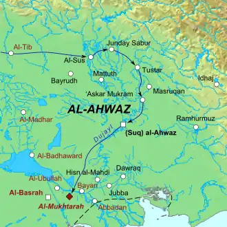 Due to their proximity to Basra, some of the border districts of al-Ahwaz were entered by the Zanj in the initial months of the revolt. The rebels' movements in the province at this stage, however, were restricted to the lands around the southern Dujayl River (the modern Karun). The Zanj secured peace agreements with some of the villages in the area; other settlements, however, resisted the rebels and were attacked as a result.[8][9]