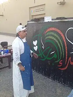 The arts centre contains a small museum in which archaeological artefacts are stored.[5] The archaeological exhibits contain relics found at sites and oases in Al Ain.[6] The arts centre also has a music room, a calligraphy room, a computer room, a photography room and a pottery room.[7] The arts center includes performance spaces.[8] The arts centre contains works by Emirati artists such as Roudha Al Shamsi, Ghanem Younes, Saoud Al Dhaheri, Khalid Al Tamimi, Ahmad Saeed Al Areef Al Dhaheri, Sarah Aladayleh and Maryam Al Suwaidi.[9] In 2018, the arts centre presented an exhibition about fashion illustration, in which it covers the variety of styles used by different designers.[10] During 2021, the cultural centre presented an exhibition with themes on the commonalities between the United Arab Emirates and Saudi Arabia, as well as an exhibition on contemporary life in the Emirates.[11] The arts centre also features murals by 12 artists from the United Arab Emirates.[12] The arts centre has presented exhibits on traditional Arabic calligraphy, the history of the country and the Emirates Mars Mission.[13]