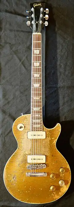 Wilson's mainstay Les Paul Goldtop was not a factory stock model. The stock tuners were replaced sometime prior to Woodstock with modern Grover tuners, as the stock tuning pegs at the time did not keep the instrument in tune as well as in later models. In addition, the pick guard and bracket were removed to provide room for his finger-picking style. The model had a stoptail bridge (an adjustable fixed-bridge piece and a separate stopbar or tailpiece) that provided both string support and intonation in one unit. It also featured Gibson P-90 single-coil pickups. Both of these latter features were keys to Wilson's tone.[33]