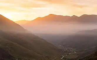 Alaniya National Park (Russian: Национальный парк «Ала́ния»), is a heavily glaciated, mountainous section of the northern slope of the Central Caucasus Mountains. It covers the southern third of the Irafsky District of the Republic of North Ossetia-Alania.[1] The park was created to have a dual purpose of serving as an ecological refuge - it has very high levels of biodiversity and vulnerable species, such as the near-endangered west Caucasian tur – and also an area of high cultural heritage and potential for recreational tourism. The park contains widespread archaeological ruins from several notable past civilizations, including the Bronze Age Koban people (1200–300 BCE), and the Alan people (100 BCE – 1234 AD). It is from the Alans that the name "Alaniya", and indirectly the term "Aryan", is ultimately derived.[2] Because altitudes in the park can span almost 4,000 meters vertical in very short distances, the slopes and valleys display strong 'altitude zoning'. These climatic zones range from alpine glaciers and peaks in the high, southern sections, to steppe grasslands in the northern reaches.[3]