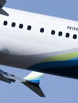 The MAX 9 has optional rear mid-cabin emergency exit doors, on each side of the aircraft behind the wings. Aircraft configured with greater than 189 seats, such as the MAX 9s operated by Lion Air (220 seats) and Corendon Dutch Airlines (213 seats), require these additional emergency exit doors and slides to meet regulatory requirements for evacuation speed. On aircraft with less dense configurations, such as those operated by Alaska Airlines (178 seats) and United Airlines (179 seats), the doors are not required and plugs are installed in their place.[5] Compared to having the exit door in place, the plug is lighter, offers a full-sized passenger window, and does not have the complexity of a door with its operations and maintenance concerns.[4] On the interior of the aircraft, the plugs are covered with cabin panels no different in appearance from a regular window panel.[6][7]