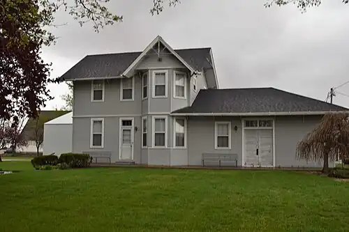 The depot is rectangular wood-frame building with a two-story section that held the passenger waiting room and station agent's office on the ground floor and the station agent's apartment on the second floor.[2] Attached to it is a single-story section that held the freight room. A large bay extended from both the agent's office and upper-floor apartment on the track side, allowing the agent a clear view down the tracks.
