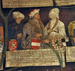 Albert and his wives Elisabeth (left) and Beatrix (right), Habsburg pedigree, 1497