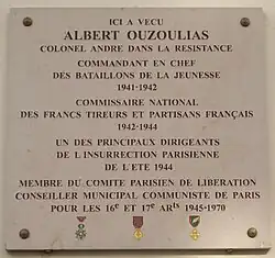 In 1946 Ouzoulias was awarded the Legion of Honour, but he did not play a major role in politics in the post-war years.[3] He was elected to the Paris Municipal Council, where he took part in heated exchanges between the Gaullists and Communists.[8] He was charged with various missions, including meetings with the Vietnamese forces before and after the French withdrawal from their colonies in Indo-China. In 1970 he became mayor of Palisse, Corrèze, where he lived in semi-retirement.[1]