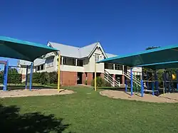 The grounds of Albert State School were extensively planted and accommodated large open play areas, typical of Queensland schools. The provision of outdoor play space was a result of an early and continued commitment to play-based education and schools were built on spacious grounds to facilitate this. The grounds were planted with trees and gardens for beautification and shade, critical in Queensland.[28] A 1915 report of Albert State School stated that the trees were tended with "solicitous care" and the school grounds were densely shaded, with classes held under the trees, benefitting the health of the pupils. The school was described as one of the "beauty spots" of the town and the Education Department should "justly be proud of its educative work in this direction".[1][29]