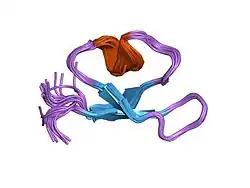 The structure reveals an inhibitor cystine knot (knottin)-like fold, comprising three beta strands.[1][2]
