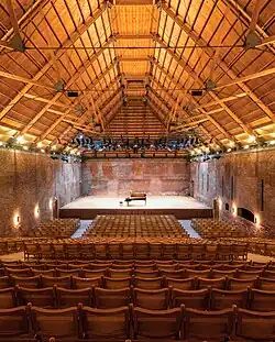 Two years later, on the first night of the 1969 Festival, the concert hall was destroyed by fire.[4] Only the shell of the outer walls remained. For that year the Festival was moved to other local venues and only one performance was lost. By the following year the hall had been rebuilt and once again it was opened in the presence of the Queen, this time at the start of the 1970 Festival. The new Concert Hall at Snape Maltings became the main focus for the Aldeburgh Festival, although performances continued to be held at all the former venues.