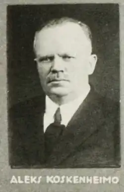 Aleksanteri Koskenheimo (11 September 1876 – 18 February 1933; surname until 1906 Brandstaka) was a Finnish schoolteacher and politician, born in Vehkalahti. He was a member of the Parliament of Finland from 1930 until his death in 1933, representing the National Coalition Party. He was a presidential elector in the 1925 presidential election. He was the younger brother of Juho Tulikoura.[1]