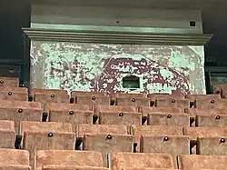 Alexandra Palace was awarded major grants from the National Lottery Heritage Fund and Haringey Council for the East Wing Restoration Project, including the theatre, which was the biggest investment in the palace for a generation.[23][26] Additional funds came from charitable trusts, businesses and individual donations. Construction in the theatre began in 2016 and included replacing the raked floor with a more versatile flat floor followed by reinstallation of the original floorboards, stabilising and sealing the plasterwork, strengthening and realigning the balcony, and installing new stairs,[18] all while retaining the original decor as much as possible in the conservation style of arrested decay,[23]