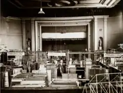 The Alexandra Palace Theatre was originally built in London, England, in 1873 for the performance of opera and ballet, but within a few weeks was burnt to the ground with the rest of Alexandra Palace. The Palace, including the theatre, was rebuilt and reopened in 1875 and is now a Grade II listed building.[1] The new theatre included a 22-foot (6.7 m) cellar below the stage which housed complex machinery for use in scene changes and movement of actors.[2][3] The theatre fell into disrepair for many years but was reopened in 2018 after refurbishment to consolidate it into a state of arrested decay. The stage machinery is one of the few surviving examples of its type in the country.[4][5]