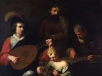 In 1709, he may have visited the Netherlands to copy the Dutch Masters. This is inferred from a sudden darkening in his palette and some copies after Dutch masters which he made later. Known to have a dissolute lifestyle, he was always in debt and often paid his creditors with small works done on the spot.[3] He was in his time referred to as a weird and strange person, in particular for his heavy drinking. According to contemporary anecdotes he always had five bottles of good burgundy with him while he painted.[7] In 1805, he was the subject of a vaudeville entitled "Grimou ou Le portrait a finir", which was staged by Maxime de Redon in Paris. From 1720 until his death, for unknown reasons, he became much more responsible and productive.