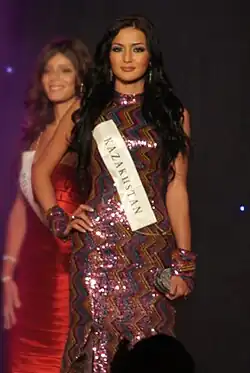 She went on to represent Kazakhstan in Miss Universe 2008 in Nha Trang, Vietnam, on 14 July 2008,[2] and Miss World 2008 in Johannesburg, South Africa, on 13 December 2008.[3] She was not placed in Miss Universe,[2] but she was among the Top 15 in Miss World.[3][4] She studied textile and manufacturing at the Almaty Technological University.[5]