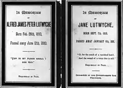 Memorial cards for Alfred James and Jane Lutwyche, buried in the churchyard of St Andrew's Anglican Church, Lutwyche, Brisbane, Queensland, Australia