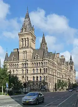 Waterhouse continued to practice in Manchester for 11 years, until moving his practice to London in 1865. At this stage of his career most of his commissions were either in the north-west or north-east of England. His earliest commissions were mainly for domestic buildings. Among Waterhouse's first commissions in 1854 were for his family: a set of stables at Sneyd Park, for his father, who had moved to Bristol, and alterations to the home of his uncle Roger Waterhouse at Mossley Bank in Liverpool.[11] In executing the commission for the cemetery buildings at Warrington Road, Ince in Makerfield (1855–56), he began his move towards designing public buildings in his developing Neo-Gothic style, building a lodge for the registrar, and two chapels, one Church of England in Gothic style, and one for Roman Catholic and Non-conformists in Norman style.[12] His first commission for a commercial building was for the now demolished Binyon & Fryer warehouse and sugar refinery in Chester Street, Manchester (1855). The building was of two floors made of brick with stone dressings and Italianate in style. The intended upper floors based on the Doge's Palace remained unbuilt.[13] Also he designed the Droylesden Institute (1858, demolished) in the Manchester suburb of Droylsden. It contained a reading room and other educational facilities and had some Gothic details. A similar building was the Bingley Mechanics' Institute built (1862–65), located in Bingley, with a hall and reading room in a Gothic style.[14]