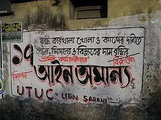 The All India United Trade Union Centre (AIUTUC), formerly known as United Trade Union Centre (Lenin Sarani) or UTUC-LS, is a Central Trade Union Organisation in India and the labour wing of the Socialist Unity Centre of India (Communist). Presently its activities are spread over 19 states. The organisation claims to have 600 affiliated unions, comprising an individual membership of over two million. It is the 6th largest trade union in India.[1] According to provisional statistics from the Ministry of Labour, UTUC-LS had a membership of 1,368,535 in 2002.[2]