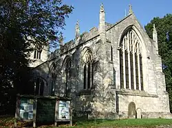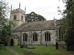 The church is built of Magnesian Limestone and is roofed with stone slates. There is a west tower, a four-bay nave with aisles and a south porch, and then a three-bay chancel with a vestry on the north side.[1] The tower has three stages; in 1844, it was recorded as having a fourth stage of later date, which has since been removed.[1][4] It is supported with buttresses and is now topped by battlements. Most of the windows have three lights and are Perpendicular in style, with the East window having five lights.[1] There are 14 stained glass windows, with the East and Millennium windows of most note.[2]