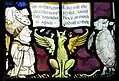 The stained glass in the windows of the south aisle depicts the eleven apostles without Judas Iscariot. They were donated in the middle of the 19th century by the Stubbs family, industrialists in Warrington.[5] The east window of the Daniell chapel includes characters from Alice's Adventures in Wonderland. The window was erected in 1935, following a memorial fund to celebrate the centenary of Carroll's birth. It was designed by Geoffrey Webb and dedicated on 30 June 1935 by Herbert Gresford Jones, Bishop of Warrington. The upper panels depict a nativity scene surmounted by eight angels, and the leftmost panel shows Lewis Carroll himself accompanied by Alice Liddell. The windows incorporate symbolic panels relating to Carroll's life, including the Cheshire wheatsheaf, the arms of Rugby School and Christ Church, Oxford, and mathematical instruments. Across the base of the window are five panels which include characters from the Alice books together with words from Carroll's poem Christmas Greetings. The characters are based on the illustrations by John Tenniel. On the south wall are windows designed by Trena Cox depicting The Flight into Egypt and The Annunciation which were donated to the church in 1960 in memory of the Broome family of Preston-on-the-Hill.[5]