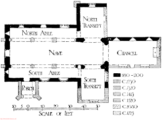 The earliest building must have been of the 12th century, as there is evidence of 13th-century additions. The transept piers do not bond into the east wall of the nave, which, with its 4 feet (1.2 m) thick wall, probably formed part of the original church. The eastern arches of the aisles spring from plain-splayed imposts, and the starting pier of the south aisle does not bond into the west wall.[7]
