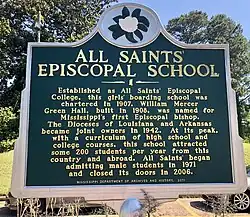 All Saints' Episcopal College was originally an Episcopal college for women in Vicksburg, Mississippi. It began accepting male boarding students as All Saints' Episcopal School in 1971. It was founded in 1908 and it ceased operating as a traditional school in 2006. Currently, All Saints' provides training to Americorps students in a residential setting.