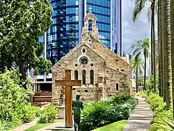 In 1988, both hall and rectory were sold and demolished for the construction of an adjacent highrise tower. In 1993, a new church hall and office complex fronting Ann Street were constructed and a substantial section of the stone wall along Wickham Terrace was demolished.[1]