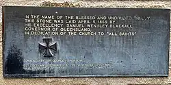 Plaque commemorating the dedication of the church by Governor Blackall in 1869