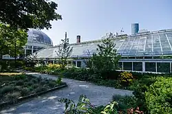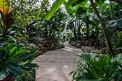 The original domed conservatory was expanded several times during the 1920s, and in 1956 and 1957, with the addition of five new greenhouse.[3][4] In 2004, a sixth greenhouse was opened at the conservatory.[6] In total, the conservatory's six greenhouses cover approximately 1,500 square metres (16,000 sq ft).[1] Two greenhouses are used to house begonia, bromeliads, gesneriads, and orchids.[5] Other greenhouses in the conservatory include a cool temperate greenhouse that houses camellias and plants from Australia and the Mediterranean; a palm greenhouse for a number of palm and tropical vines; the tropical landscape greenhouse for plants like cycads, hibiscus; and the arid house for cacti and succulents.[5]