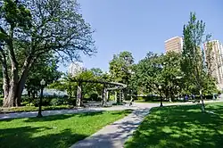 In 2003, the University of Toronto and Toronto-Dominion Bank financed the construction of a sixth greenhouse for the conservatory, named the Children's Horticultural Conservatory.[6] The greenhouse was built by the university in order to house specimens held at the university's old greenhouse on College Street (relocated to Allan Gardens as site was needed for the Leslie Dan Faculty of Pharmacy Building[7]).[6] The park was also among several municipal parks occupied by protesters during the 2010 G20 Toronto summit protests.[3]