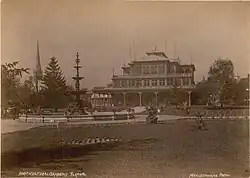 The original rustic wooden structures were replaced in 1879 with a new three-storey pavilion to be used for concerts, gala balls, conventions, and flower shows.[3][2][5] Construction of the new pavilion was financed through a C$20,000 mortgage taken out from the horticultural society.[3] Because the horticultural society was unable to cover its debts, the conservatory was later sold to the municipal government in 1888.[3] In the following year, iron fencing and gates were added to the park.[4]