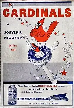 The Cardinals played at Fairview Field until 1948.[2] In 1949, the team began play at the newly built Breadon Field, a steel and concrete stadium that seated 5,000 fans, which was located just north of the city in Whitehall Township.[3] Poor attendance led to the teams demise after the 1956 season.