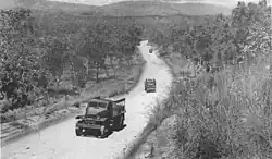 When the campaign began, the Kokoda Track started at McDonald's Corner, just beyond Ilolo. From there, the track slowly rose about 670 metres (2,200 ft) to what later became known as Owers' Corner.[99] The road from Port Moresby was sealed as far as Seven Mile, and from there a gravel surface was laid to provide an all-weather road as far as Sogeri, roughly 51 kilometres (32 mi) from Port Moresby.[100] On 24 June, GHQ queried whether it would be possible to upgrade the track to one that could handle animal transport or, better still, motor vehicles. There were multiple tracks leading to Kokoda, and in addition to the main track, there was interest at New Guinea Force HQ in a route along the Brown River that had been partially surveyed in 1912.[101]