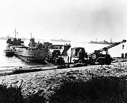 A US Navy salvage party and a detachment of the 1051st Engineer Port Construction and Repair Group arrived on 1 September.[81] The 1051st was a specialized formation that had previously handled the rehabilitation of the ports of Palermo and Naples.[83] The divers of the 1051st discovered that the port and berth entrances had been blocked by 33 ships. Some 65 ships had been scuttled in the harbor channels in a criss-cross arrangement, sometimes in two or three layers. Seven large ocean-going ships had been sunk in a heap at the harbor mouth to block it. The pattern of scuttling and demolition was designed to preclude the laying of piers over sunken ships, as had been done in Naples.[80][81]