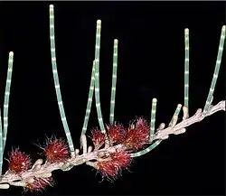 Allocasuarina lehmanniana is a dioecious, or less commonly a monoecious shrub that typically grows to a height of 1.5–4 m (4 ft 11 in – 13 ft 1 in). Its branchlets are up to 120–200 mm (4.7–7.9 in) long (depending on subspecies), the leaves reduced to scale-like teeth 0.4–0.8 mm (0.016–0.031 in) long, arranged in whorls of six to eight around the branchlets. The sections of branchlet between the leaf whorls (the "articles") are mostly 5–9 mm (0.20–0.35 in) long and 0.7–1.2 mm (0.028–0.047 in) wide. Male flowers are arranged in spikes 10–30 mm (0.39–1.18 in) long, in whorls of five to eight per centimetre (per 0.39 in.), the anthers 0.6–0.9 mm (0.024–0.035 in) long. Female cones are on a peduncle 2–38 mm (0.079–1.496 in) long, the mature cones 12–35 mm (0.47–1.38 in) long and 7–12 mm (0.28–0.47 in) in diameter containing black samaras 4.0–5.5 mm (0.16–0.22 in) long.[2][3]