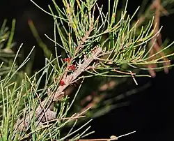 - Allocasuarina mackliniana subsp. xerophila L.A.S.Johnson[12] is intermediate between the other two subspecies, and has articles 7–13 mm (0.28–0.51 in) long, seven or eight teeth, the "ribs" nearly flat to slightly rounded and the furrows between the ribs softly hairy when young.[13][14]