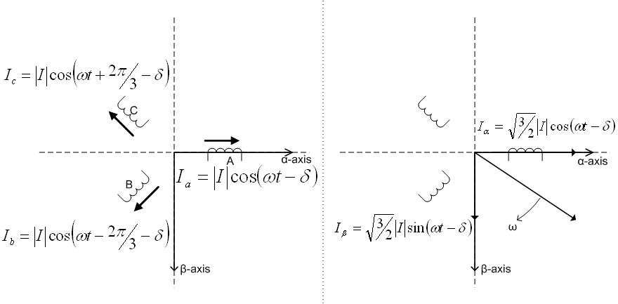 The transform is conceptually similar to the transform. Whereas the transform is the projection of the phase quantities onto a stationary two-axis reference frame, the transform can be thought of as the projection of the phase quantities onto a rotating two-axis reference frame.