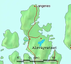 Alsvågvatnet[2] is a lake which lies in Øksnes Municipality in Nordland county, Norway. It is located on the island of Langøya in the Vesterålen archipelago. There is birch woodland and bogland nearby. The 2.36-square-kilometre (0.91 sq mi) lake sits at an elevation of 8 metres (26 ft) above sea level, about 1.3 kilometres (0.81 mi) west of the village of Alsvåg, along the road to Myre.[3]