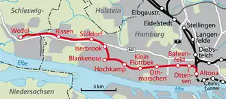 Like the line from Hamburg, the Blankenese-Wedel extension is connected to the eastern end of the station, so trains have to reverse out of the station to continue their journey. The line then runs to the stations of Iserbrook, Sülldorf, Rissen and finally, the terminus at Wedel. Unlike the section east of Blankenese, the extension to Wedel is mostly single track.