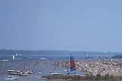 Alum Creek State Park offers year-round recreational opportunities. Park activities include camping, hunting, hiking, picnicking, mountain biking, snowmobiling, horseback riding, RC flying, fishing, ice fishing, boating, ice boating, and swimming. There are 38 miles (61 km) of bridle trails, 7 miles (11 km) of hiking trails, and 14 miles (23 km) of mountain biking trails. The lake has five boat ramps with boats of unlimited horsepower permitted. Southeast of the dam gates is Dinneen RC Field, featuring a 900-foot long RC aircraft runway. The campground has 286 sites with electricity, showers, restroom, basketball courts, horseshoe pits and playgrounds. There are also cabins and a primitive camp along the bridle trail. The park's 3,000-foot (910 m) beach is the largest inland beach in Ohio[4] and includes a beach house and beach volleyball courts. The lake is open to ice fishing during the winter months.[3] Game fish found in the lake include large mouth and small mouth bass, bluegill, crappie, sunfish, channel catfish, saugeye, walleye and muskellunge. Saugeye and muskies are stocked by the State of Ohio, Division of Wildlife, and fishing tournaments are hosted throughout the year.[3] Common game species at the park include white-tail deer, squirrels, and raccoons.[4]