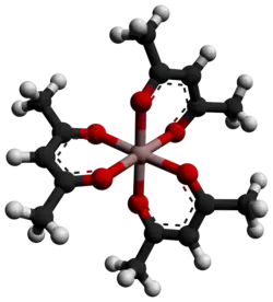 Aluminium acetylacetonate, also referred to as Al(acac)3, is a coordination complex with formula Al(C5H7O2)3. This aluminium complex with three acetylacetone ligands is used in research on Al-containing materials. The molecule has D3 symmetry, being isomorphous with other octahedral tris(acetylacetonate)s.[2]