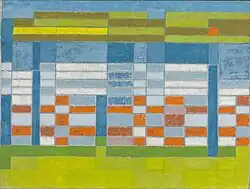 During the Jewish Women's Archive oral history interview, Rothschild said that she her style gradually evolved from realist to abstract during the 1940s and early 1950s. She made the change on her own in a slow self-taught process.[4] In viewing a retrospective exhibition of her work, a critic said in 2012 that Rothschild's 1948 oil painting "Portrait of Me (Self Portrait with Crossed Arms)" seemed to be a transitional work, particularly as it emphasized Rothschild's angular shoulders and arms.[21] In the interview, she also said her experience as a volunteer art therapist in the 1950s helped her to move away from planned and structured work and to move toward a more spontaneous expression of emotion. In 1958, a gallerist described the paintings in her emerging geometric style as "personal abstract statements characterized by subtlety of color, symbol, and pattern."[22] Her interest in the human figure persisted even as what was seen as her "distinctive take on geometric abstraction" evolved, and many of her paintings contain elements that derive from parts of the body as seen from unusual angles.[21][23] The 1968 acrylic painting "Ripening of the Oranges, Sicily" (shown at left) is said to be a first-rate example of how she relied upon a "gridded composition that allowed for both structural variation and representational allusion."[21]