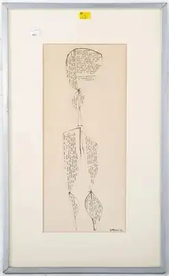 During the years in which sculpture dominated her output she continued to make quick and spontaneous works on paper, both drawings and watercolors.[3] One of these drawings, "Art Quotes" (1966) can bee seen at right. Shortly before her death she made a return to figuration in a set of small works on paper prepared for a solo exhibition at the C.Grimaldis Gallery called "Artist and Model." A critic said that in these works (in ink, watercolor, and oil) she explored how the models the artists depicted could be "reduced to their definitional lines," showing them as compositional elements rather than living beings.[27]