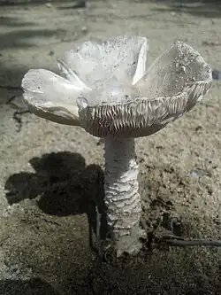 Amanita arenicola, commonly known as the beach-loving ringless amanita, is a species of mushroom-forming fungus in the family Amanitaceae.[2] It is characterized by its gray cap, white stipe with wart-like protrusions, and affinity for sandy shores. Similar to A. vaginata, it lacks a ring on its stem. It can be found on America's Atlantic coastlines.