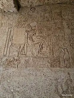 4. ^ The name of Aten, inscribed in two cartouches like that of the king, is reported in the so-called first didactic form used from Year I to Year 9: Long live Re-Hor-achti who rejoices in the horizon, in his name of Shu which is Aten, while in other inscriptions, the second didactic name was used from Year 9 onwards: Long live Ra sovereign of the Two Horizons who rejoices in the horizon, in his name of Ra which is Aten with the elimination, therefore, of references to other Egyptian divinities other than Ra, that is, the purest manifestation of the sun.