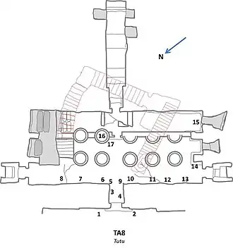 The architectural plan of TA8 presents a short corridor that, starting from the external façade, leads into a transversal colonnaded room (6 columns and 6 pilasters of columns) in which some lateral rooms open (some unfinished). In the centre of the eastern wall, there is a corridor perpendicular to the previous room, while in the eastern corner of the transversal room, a staircase leads to the underground apartment. Tomb TA8[2] has a façade that recalls the entrance of a mastaba; the low height of the cliff in which the tomb is dug was compensated by digging the pavement to a level lower than the surrounding walking surface. The façade has, on the sides of the entrance, the peculiarity of having (nos. 1 and 2 in the plan) twelve columns of text (7 on the left and 5 on the right) which are heavily damaged;[3] three princesses with sistrums, wet nurses, flabellum bearers and scribes are also represented here, accompanying King Akhenaten and Queen Nefertiti and, perhaps, the latter's sister Mutnodjemet. A series of hieroglyphics converge towards the centre of the entrance from which a corridor, on whose walls (3–4) the royal family is represented in adoration of the Aten and the deceased on his knees, leads into a colonnaded room with six columns and a wall, parallel to the series of columns, from which an equal number of pilasters of columns protrude. On the walls: in the upper part (5–7) the deceased in the presence of the images of the king and queen (destroyed) seated in front of an entrance to the Royal Palace, in the presence of officials and courtiers. In the lower part (6–7) the deceased and some people praying; followed (8) by the representation of the deceased, officials and servants, outside the Palace. Likewise on another wall (9–11), in the upper part the deceased is awarded by the king and queen who look out from a balcony in the presence of strangers, officials, servants, while below some chariots are shown waiting. Followed, in the lower part (10–11), the deceased and some people praying; a little further on (12–13) in the upper part the deceased is escorted home by some friends. On the architraves of two lateral rooms (14–15) the deceased is shown kneeling in adoration of the cartouche of Aten[4] On one of the columns (16) and on the corresponding architrave (17) scenes of the royal family in adoration of Aten and of the deceased on his knees appear.[5][6]
