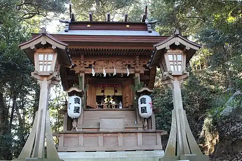 The Ōmika Shrine in Hitachi (Ibaraki Prefecture) enshrines Mikaboshi-Kagaseo (甕星香々背男) as a landlord deity (地主神, Jinushigami) alongside Takehazuchi-no-Mikoto (武葉槌命).[12] Additionally, a "spirit-housing stone" (宿魂石, Shukukonseki) within the shrine's precincts is believed to contain Mikaboshi's "violent spirit" (荒魂, Ara-mitama).[13]