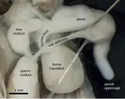 Ambigolimax valentianus is identifiable from the internal genitalia, which require dissection to examine. In particular it has a substantial sausage-shaped penial appendage at the inner end of the penis; rarely the appendage is swollen towards its tip.[9] Sometimes the appendage appears absent because it is inverted into the lumen of the penis.[8] This might cause confusion with A. parvipenis but the penis of A. valentianus without the appendage is about as long as the bursa copulatrix and its duct, whereas it is only about half the length in A. parvipenis.[10]