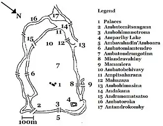 The earliest of the royal compounds at Ambohimanga, Bevato ("many stones", also called Fidasiana-Bevato), was first established by Andriamborona, who built houses there for himself and his family in the late 17th century.[12] It was inhabited by Andriantsimitoviaminiandriana from 1710 to 1730,[29] during which time he expanded the compound on three occasions.[12] The compound was originally surrounded by a low rock wall that was replaced under Andriambelomasina by a wooden palisade. Ranavalona I expanded the compound toward the west by relocating a small house containing the royal idol Rafantaka; further westward expansion was completed under Ranavalona II. Under Ranavalona I and her successors, Besakana served as the residence of the sovereign's relatives during their visits to Ambohimanga. All buildings on the compound were destroyed by the French, who constructed a school on the site (Ecole Officiel), later followed by the Ambohimanga town hall (Tranompokonolona), which was razed after Madagascar regained independence.[12]