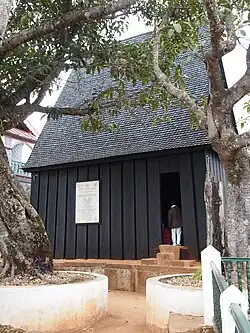 Among the buildings extant at the royal city during the time of King Andrianampoinimerina (1787–1810), only the original Mahandrihono palace remains intact. The Mahandrihono palace, which served as the home of Andrianampoinimerina before he relocated the political capital of Imerina to Antananarivo,[10] has been preserved in its original state since construction, excepting the replacement of the original roof thatch with wooden shingles.[14] The simple wooden structure is constructed in the traditional style of the aristocracy of Imerina: the walls are made of solid rosewood and topped by a peaked roof that is supported by 10-meter central rosewood pillar, much like the one that had originally supported the roof of the Rova Manjakamiadana of Antananarivo before it was destroyed by fire in 1995.[40] The roof horns (tandrotrano) formed at each end of the roof peak by the crossing of the gable beams were originally silver-plated, and a silver eagle was affixed in the middle of the roof peak. Silver ornaments were also hung from the corners of the roof in the interior of the house.[36] The building's name is inscribed on a white marble plaque affixed to an exterior wall near one of the building's two entrances. This house contains a number of items that belonged to Andrianampoinimerina, including weapons, drums, talismans, a board of fanorona and a bed raised on stilts.[40] During Andrianampoinimerina's time, his wives were allowed to visit this building but not allowed to sleep there overnight.[26] The site is highly sacred: Queen Rasoherina and her successors often sat on the stepping stone at its threshold to address their audience,[12] and many pilgrims come here to connect with the spirits of Andrianampoinimerina and his ancestors. Visitors are asked to enter the house by stepping in with their right foot and exiting backwards, according to custom, in order to show respect for the spirit of Andrianampoinimerina.[40]