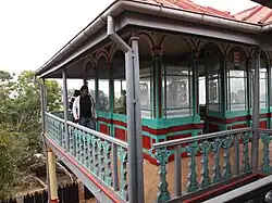 The second, smaller pavilion is known as the Tranofitaratra ("house of glass")[10] and was constructed in 1862 under the orders of Ranavalona II.[42] The queen would gather her ministers for counsel in this building, and the large windows on all four sides of the building provided a view of the countryside below, enabling the queen to ascertain the security of her surroundings. The glass used in the construction was imported by an Englishman named Parrett in 1862.[12]