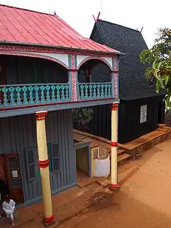 During the reign of Andrianampoinimerina, Nanjakana enclosed five houses that served as residences for his children.[24] The house called Nanjakana ("place of royalty") was built by Andriambelomasina and renovated by Andrianampoinimerina, who moved it into the compound and lived in it before succeeding to the throne.[12] He renovated it for use by his son, Radama I, who slept here during visits to Ambohimanga after succeeding his father as King of Madagascar.[2] According to oral history, a large stone near the Nanjakana house was used as a seat by Andriambelomasina and Andrianampoinimerina when reflecting on governance decisions. Andrianampoinimerina added a two-story house called Manambitana ("favored by fate") that was the largest of all the traditional houses at Ambohimanga. The king's children slept on the upper floor during visits to the royal city, while the ground floor housed such royal property as palanquins and storage chests.[12] This house was destroyed in the 1861 fire and was reconstructed under Rasoherina, who used it as a residence.[36] After removing the historic Manandraimanjaka house from the Mahandrihono compound, Andrianampoinimerina built a new house with the same name in the Nanjakana compound. This was likewise destroyed in the 1861 fire, and was later rebuilt by Ranavalona II. Also destroyed in the fire was a house called Fohiloha ("short") that Ranavalona I had relocated from the royal compound in Antananarivo to the Nanjakana compound at Ambohimanga in 1845; Fohiloha was later rebuilt by Rasoherina.[12] Other buildings that Ranavalona I moved from the rova at Antananarivo to the Nanjakana compound at Ambohimanga included Kelisoa ("beautiful little one") and Manantsara.[39]